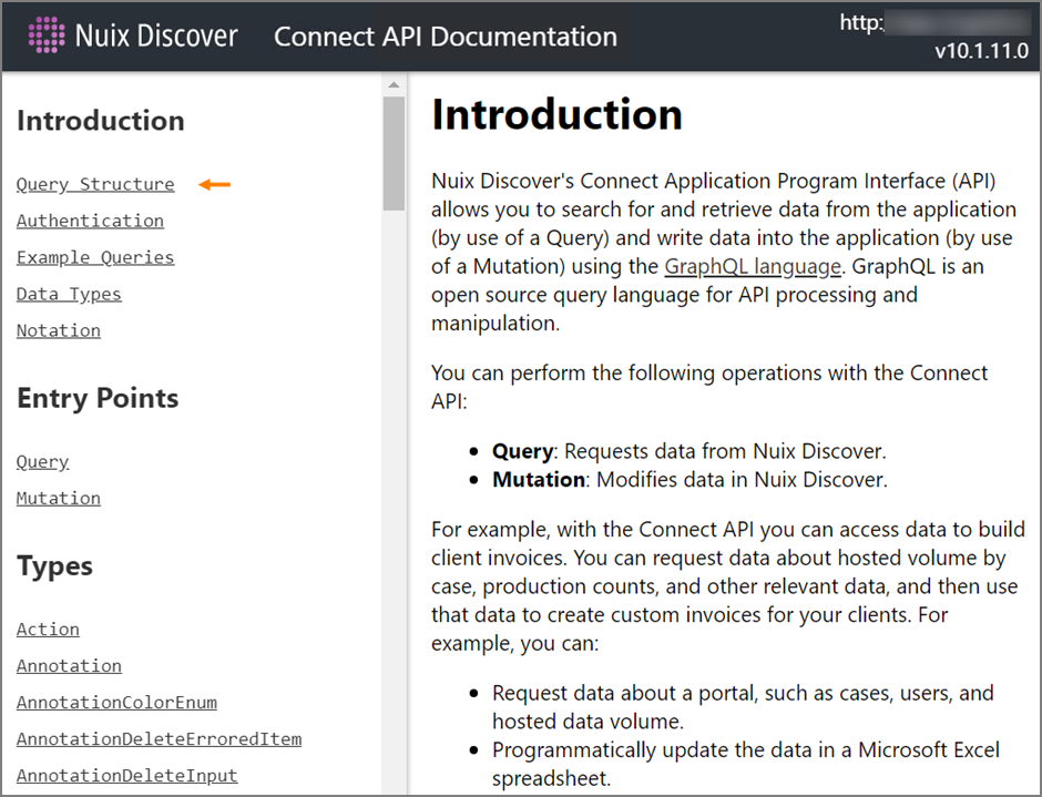 Note: The top-right corner of the Connect API Documentation tab shows your specific URL location of the documentation and the current version of the document.